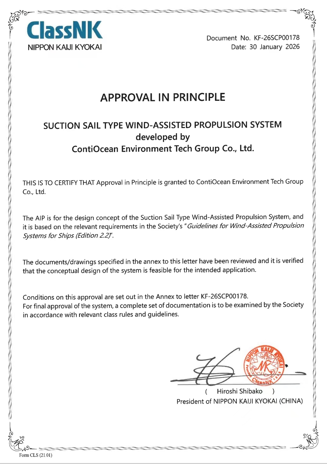 2026年1月30日下午15时,在日本今治举办的NK(日本海事协会)季末论坛会上,上海汇舸环保科技集团股份有限公司( “汇舸集团”)隆重举行了吸力风帆产品发布会,来自全球的150余位船东及船厂代表共同见证这一历史性突破。同一时刻,汇舸吸力风帆正式获得NK船级社颁发的AIP(原则性认可)形式认可证书,标志着该创新技术在安全性、可靠性及环保性能方面获得国际权威认证,为船舶绿色航运发展注入强劲动力。