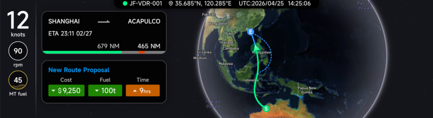 今年2月,汇舸集团顺利开展了汇舸环保智慧船舶系统(COIVS)首台套试验项目,并成功融合了九方科技的气象导航功能(JoPilot)。该项目的顺利推进与运行,为双方合作成果在真实业务场景中的应用提供了强有力的验证,也为智能气象导航等后续产品的持续优化与深化拓展奠定了坚实基础。