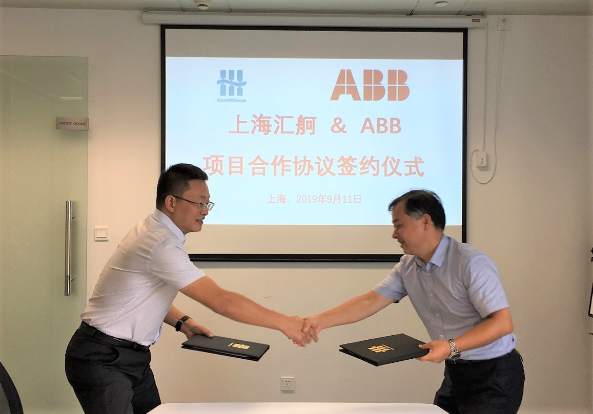 The signing ceremony for cooperation agreement in marine EGCS Digital control system between Shanghai ContiOcean Environment Tech Co., Ltd and ABB Beijing Drive Systems Co., Ltd, was held in ContiOcean Group headquarter on Sep 11th 2019. As representatives from both sides, Mr. Zhou Yang, the chairman of ContiOcean Group, and Mr. Liang Xianglun, the regional sales manager of ABB Huadong district (Drive and Control Department), signed on the cooperation agreement.