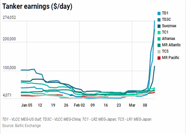 After Saudi Arabia fired the first shot in an all-out price war among crude producers last weekend, tanker earnings have been rising rapidly with floating storage requirements and rising Middle Eastern crude exports.